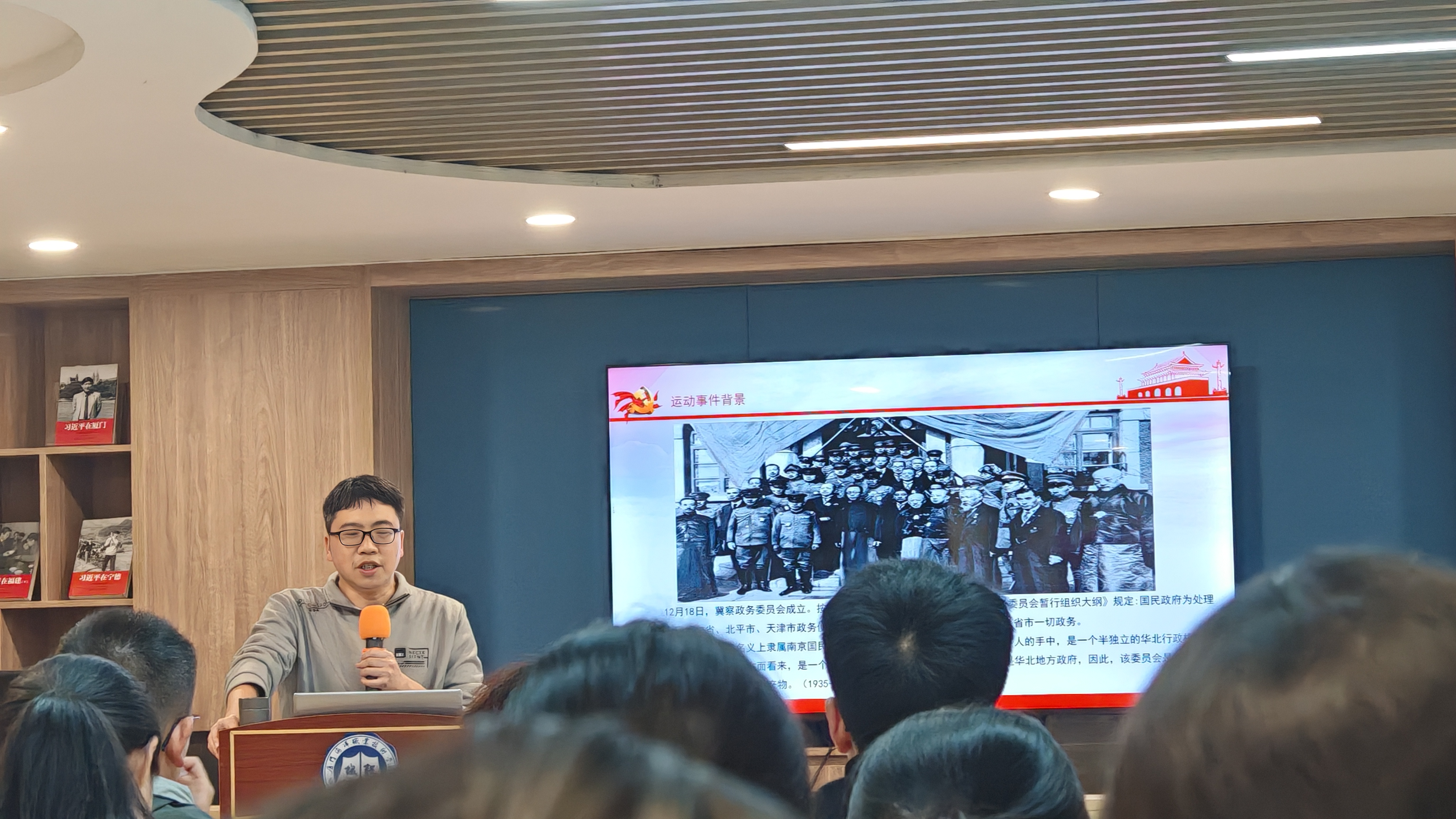 为深入学习贯彻党的二十届四中全会精神,弘扬伟大抗战精神,纪念“一二·九”学生爱国运动90周年,加强我校青年学生爱国主义教育,12月9日,我院朱炜老师在翔安校区“一站式”学生服务社区党群活动中心以“铭记峥嵘岁月,砥砺复兴伟业”为主题作专题宣讲报告,校青马班学员及我院各理论读书社学生代表参加报告会。(图文:朱炜)