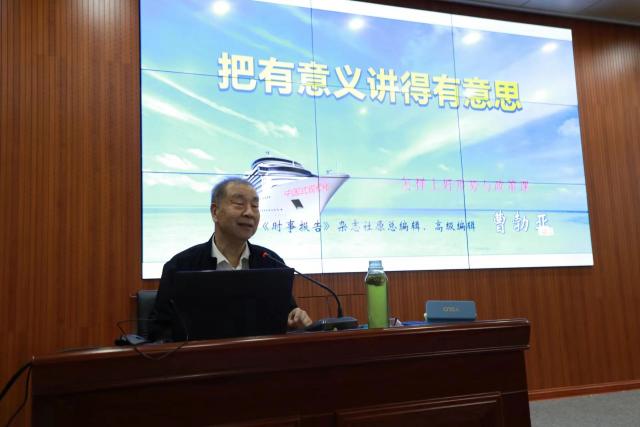 专家讲座环节:中宣部《时事报告》杂志社原总编辑曹勃亚高级编辑作“把有意义讲得有意思——怎样上好形势与政策课”专题报告,从讲足中国平视世界的底气、情怀不能缺席、小故事大道理、镜片让世界不同、简约往往胜过万语千言等五个方面为上好“形势与政策”课提供教学思路与经验借鉴,启迪大家讲授“形势与政策”课如何从大处着眼,小处着手让学生入心入脑。