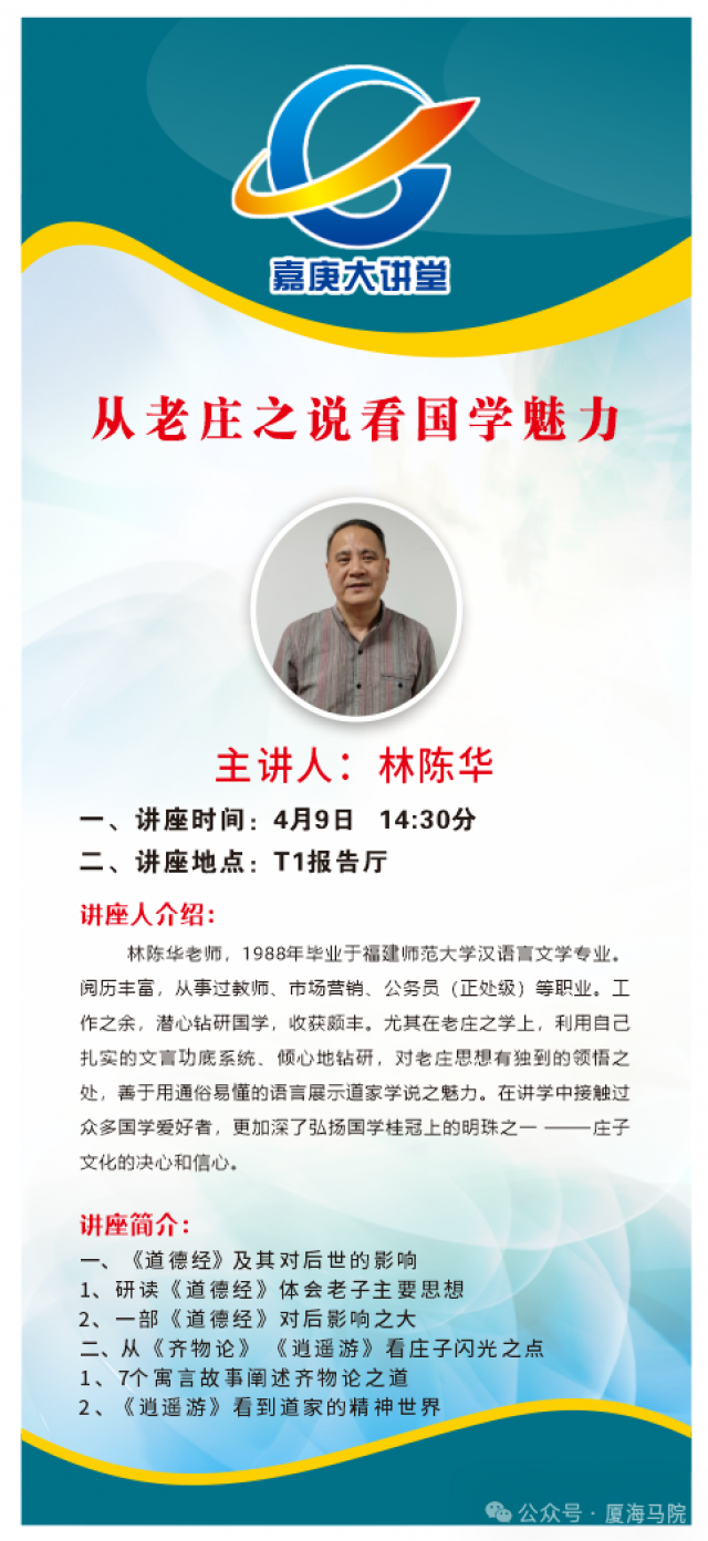 林陈华,1988年毕业于福建师范大学汉语言文学专业。阅历丰富,从事过教师、市场营销、公务员(正处级)等职业。工作之余,潜心钻研国学,收获颇丰。尤其在老庄之学上,利用自己扎实的文言功底系统、倾心地钻研,对老庄思想有独到的领悟之处,善于用通俗易懂的语言展示道家学说之魅力。在讲学中接触过众多国学爱好者,更加深了弘扬国学桂冠上的明珠之一----庄子文化的决心和信心。