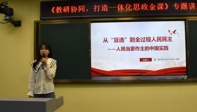 为创新大中小学思政课一体化建设模式,仪式结束后,厦门海洋职业技术学院马克思主义学院、厦门市翔安区思政课一体化研究中心携手三明市大田县教育局举行“学思想讲道理育新人”同一主题说播课活动。我院青年教师孙晓彤开讲《从“豆选”到全过程人民民主——人民当家作主的中国实践》。希望通过此次共建活动,打破大学、中学、小学思政课教学的壁垒,高校的“大手”能紧紧拉住中小学的“小手”,共同推进思政课一体化建设,建设“大课堂”、搭建“大平台”、建好“大师资”,打造高水平思政“金课”,共同发挥思政课育人的作用,为培养堪当民族复兴重任的时代新人贡献力量。