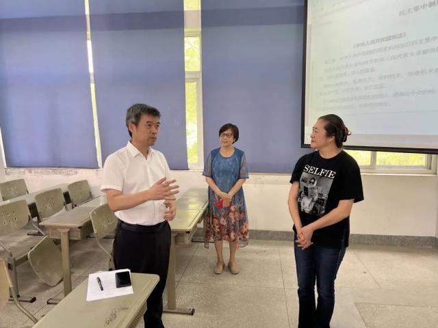 听课过程中,陈昌萍认真专注听取教师讲授,仔细观察学生的课堂反应及听课情况,并结合课堂内容作了详细记录。在与师生亲切交流时,对张盼老师的教学准备、教学态度、教学内容和沈红老师理论功底、教学方法、教学效果等给予肯定,并结合当前思政课面临的基本形势和我校学生的实际情况,就教学方法、教学重点难点、理论联系实际等问题与两位老师进行了交流探讨,提出了指导性意见和建议。