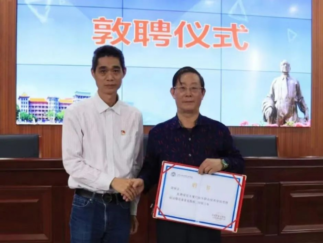 ​  讲座开始前还举行了思想政治理论课客座教授特聘仪式,马克思主义学院院长林杰钦代表学校为周钟法老师颁发聘书。