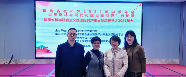 2021年12月18-19日,马克思主义学院赖蔚英教授带队赴福州参加福建省科学社会主义暨国际共产主义运动史学会学术年会。年会由福建省社会科学界联合会主办,福建省社会科学主义暨国际共产主义运动史学会、福建农林大学公共管理学院、福建省社会科学研究基地新时代乡村治理研究中心承办。会议采取线上线下相结合的方式,来自福建省内各高校、党校的师生代表70余人参加了线下会议。