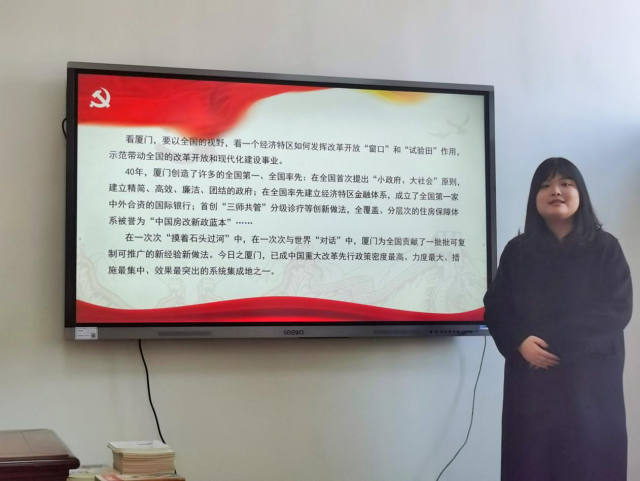 图二 支部副书记李东上《学习贯彻习近平总书记致厦门经济特区建设40周年的贺信》党课