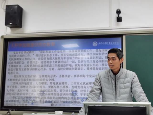 林杰钦传达了关于印发《厦门海洋职业技术学院教职工 2021 年度考核工作方案》的通知、关于印发《厦门海洋职业技术学院 2021 年教职工师德师风考核工作办法》的通知等有关政策文件,肯定了学院认真落实意识形态工作责任制、切实加强师德师风建设取得的积极成效,就更好开展意识形态建设、师德师风建设工作进行了严密部署。