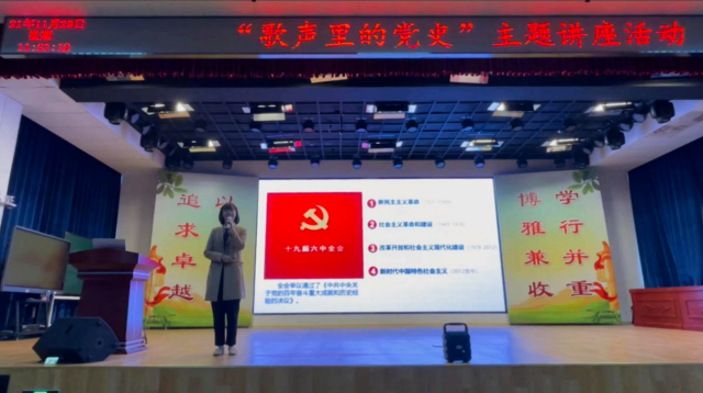马克思主义学院王靓靓老师以歌叙史,通过《南湖的船党的摇篮》、《我们是共产主义接班人》、《春天的故事》、《灯火里的中国》等几首耳熟能详的红色歌曲清晰展现中国共产党经历开天辟地、改天换地、翻天覆地、惊天动地的百年奋斗历程,使学生沉浸于音乐美的同时了解歌声背后的历史故事,充分认识到是中国共产党带领中华民族迎来了从站起来、富起来到强起来的伟大飞跃,迎来了实现伟大复兴的光明前景,为中国共产党的发展和成就感到骄傲和自信。在热烈的现场气氛中,学生们合唱了《我们是共产主义接班人》,用朝气蓬勃的歌声表达对中国共产党的热爱,展现了新一代共产主义接班人良好的精神面貌。