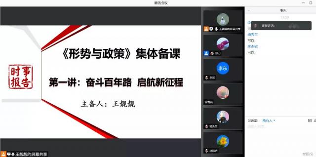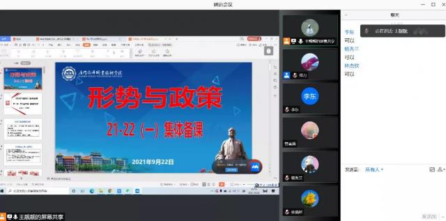 会上,形势与政策教研室主任邓力就新学期教学任务、线上教学注意事项、课程发展平台和学习通课堂应用等工作进行安排布置。王靓靓、曾雪满、李东、杨秀兰四位主备课教师就《奋斗百年路 启航新征程——学习习近平总书记“七一”重要讲话精神)》《“正确认识我国人口问题”》《完善一国两制制度体系 护航香港长治久安》《共同构建人与自然生命共同体》等专题开展集体备课,主备课教师讲得激情四溢,与会教师听得聚精会神。每个专题讲完之后,与会教师都会就具体问题进行深入探讨,并提出各自建议和意见。经过数小时的激烈讨论,教师们纷纷表示受益颇丰。