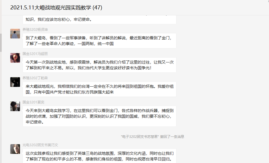 通过本次实践教学活动,同学们感触颇多。他们纷纷表示,要牢记炮战历史,弘扬三岛精神,要背负起革命先辈的期盼,珍惜来之不易的美好生活,更要努力为维护祖国和平统一而奋斗。