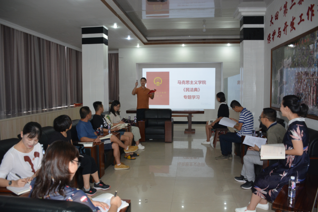 为深入学习宣传普及《中华人民共和国民法典》,9月5日上午,马克思主义学院全体思政教师就学习《民法典》相关内容和精神融入教学开展了集体学习备课活动。学院思政教师集中学习了习近平总书记在中央政治局第二十次集体学习时的讲话精神、《中华人民共和国民法典》有关内容。