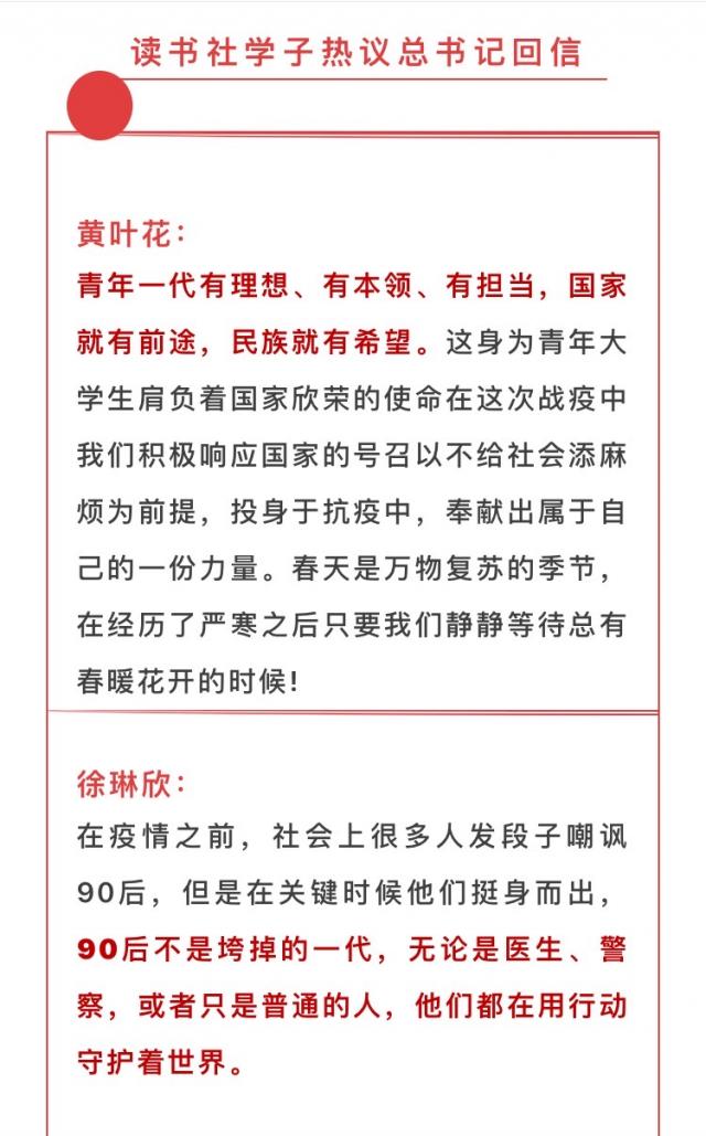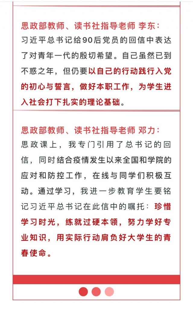 近日,学院习近平新时代中国特色社会主义思想读书社积极组织读书社学子以线上沙龙、集中讨论的形式,深入学习习近平总书记的回信精神。学院的“90后”“00后”们学习了总书记的回信内容后,大家倍感振奋和鼓舞,在海院师生中引起热烈反响。