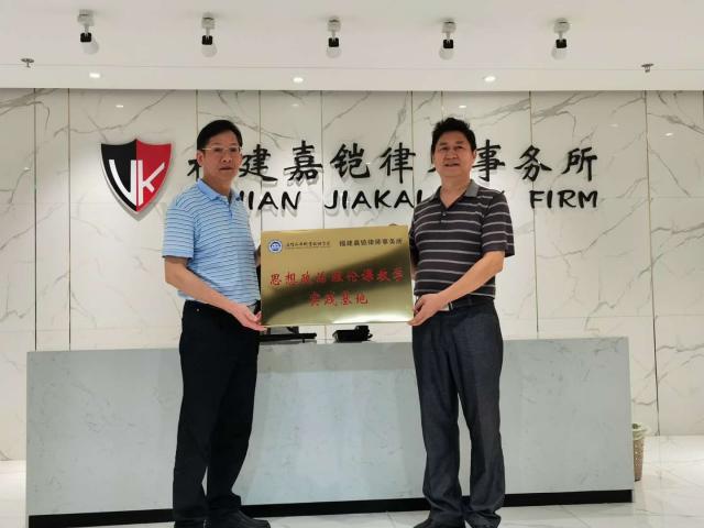为深入贯彻习近平总书记在学校思想政治理论课教师座谈会上的重要讲话精神,进一步充实大学生社会实践内容,6月8日上午思政部在福建嘉铠律师事务所举行思想政治理论课教学实践基地签约、挂牌仪式。思政部主任王斌及思政部部分教师,福建嘉铠律师事务所主任康艺能、中共福建嘉铠律师事务所党支部书记马涛及全体合伙人参加了此次签约挂牌活动。