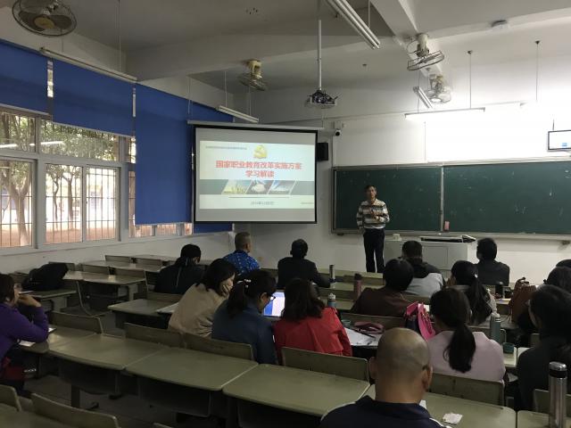 叶小超结合学院教学工作实际,围绕方案的起草过程、方案的主要内容、方案的创新点等内容,对《国家职业教育改革实施方案》中完善国家职业教育制度体系、构建职业教育国家标准、促进产教融合校企“双元”育人、建设多元办学格局、完善技术技能人才保障政策、加强职业教育办学质量督导评价、做好改革组织实施工作7个方面20项具体措施进行深入学习,分条缕析,层层解读。