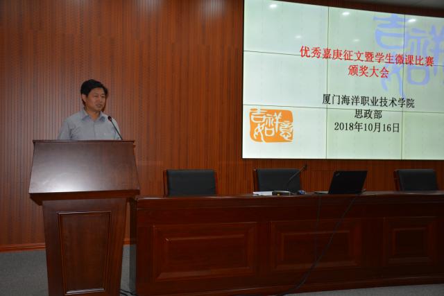 表彰大会期间展示了优秀学生微课教学视频,思政部王斌主任做了总结性讲话。王斌主任充分肯定了举行学生嘉庚征文竞赛和学生微课比赛活动的意义,对18级新生代表提出了更高的期许和要求。