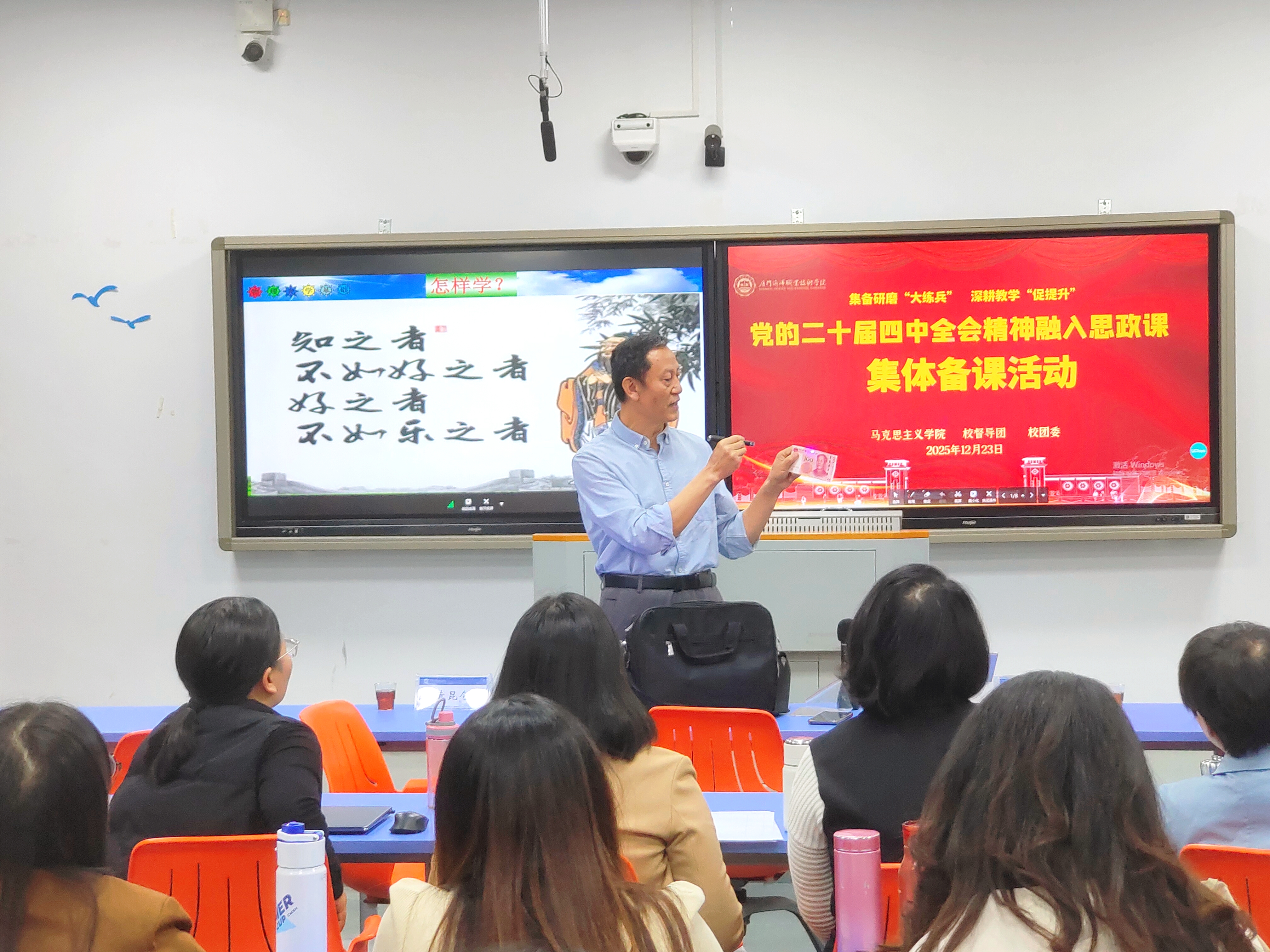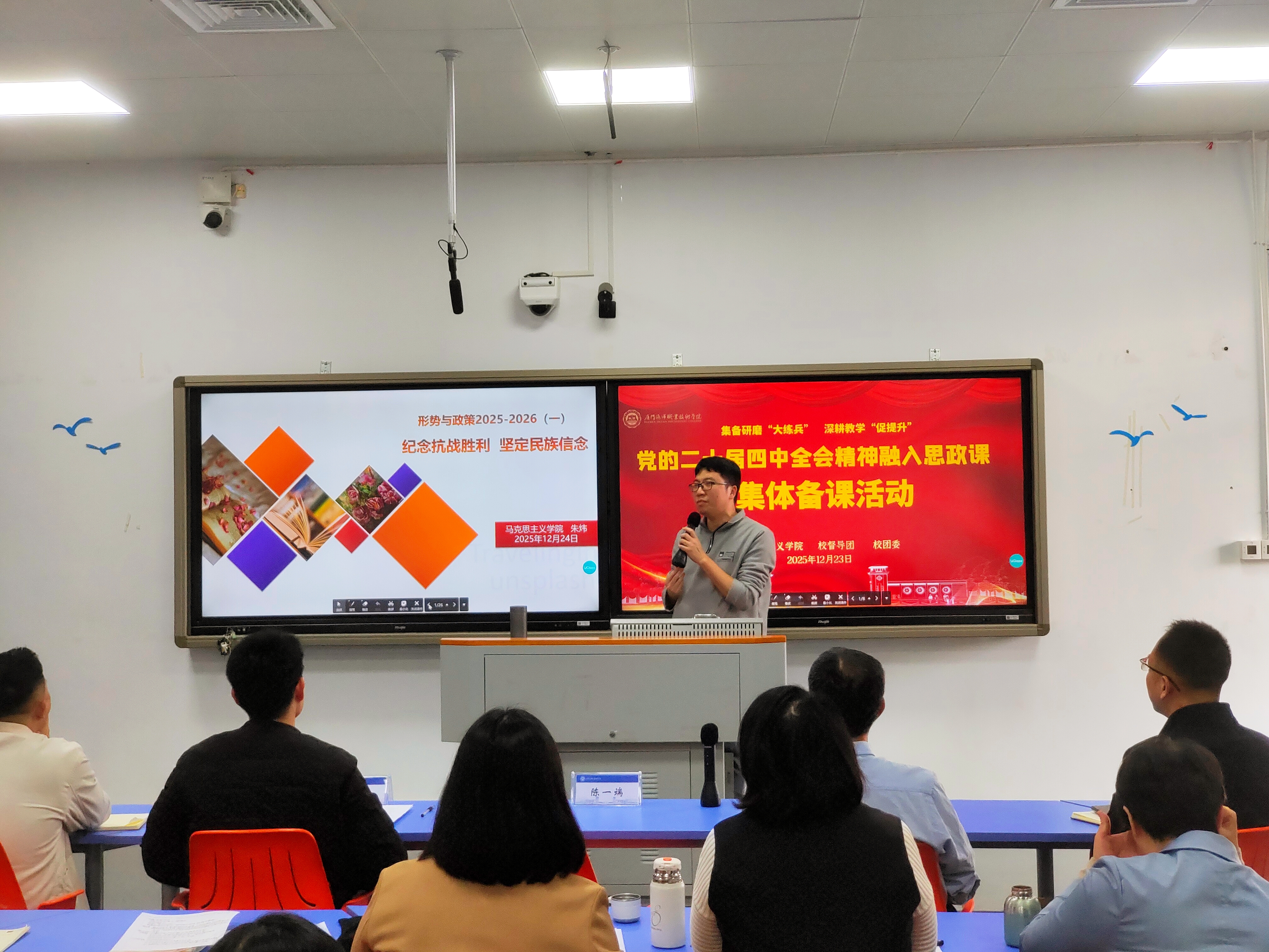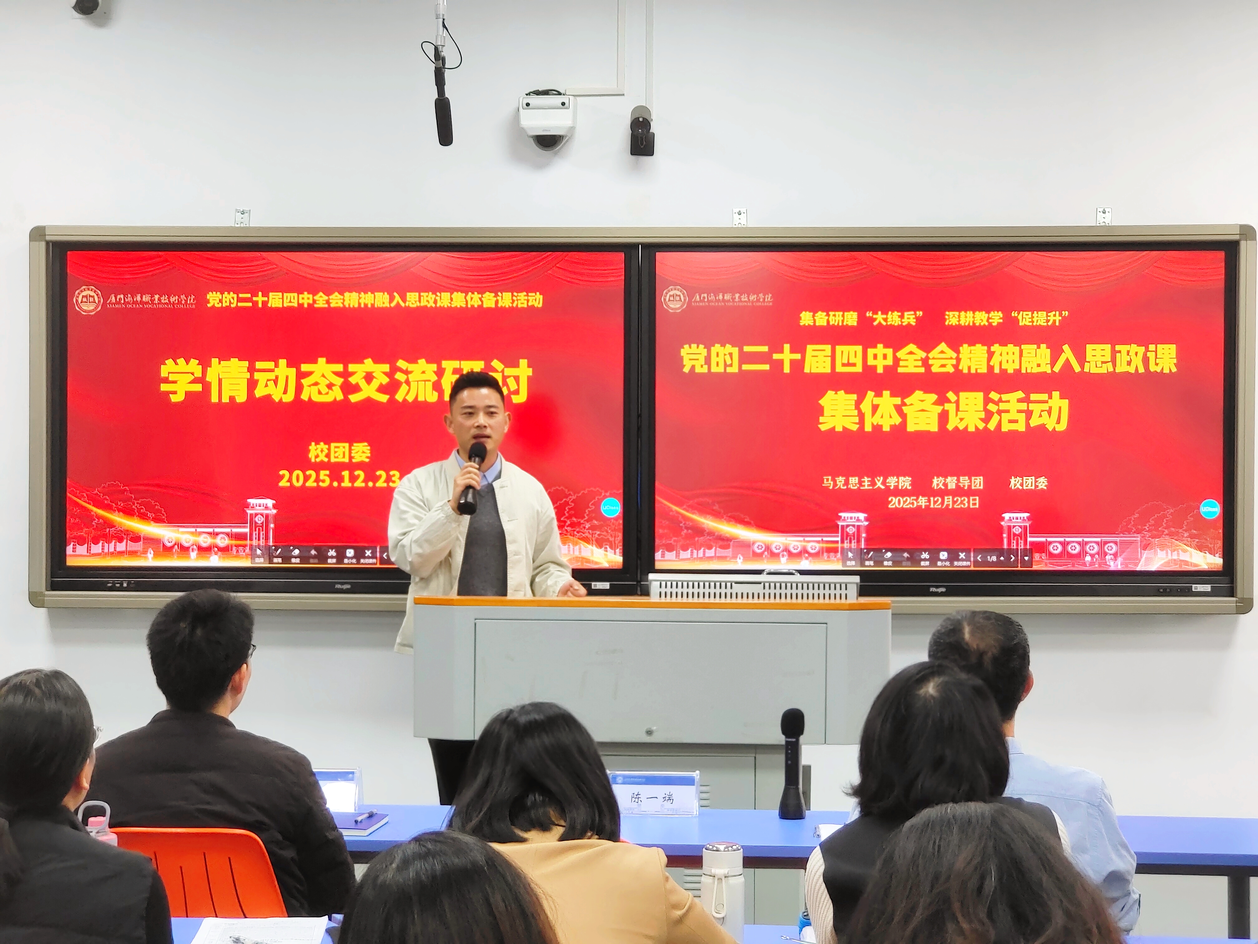 为深入学习贯彻党的二十届四中全会精神,推动全会精神融入思政教育教学实践,12月23日,我院在翔安校区1503智慧教室举行“党的二十届四中全会精神”融入思政课集体备课会。校党委书记陈一端到会指导,校督导团团长宋贵才教授、校团委副书记黄昆仑以及马克思主义学院全体教师参会。
