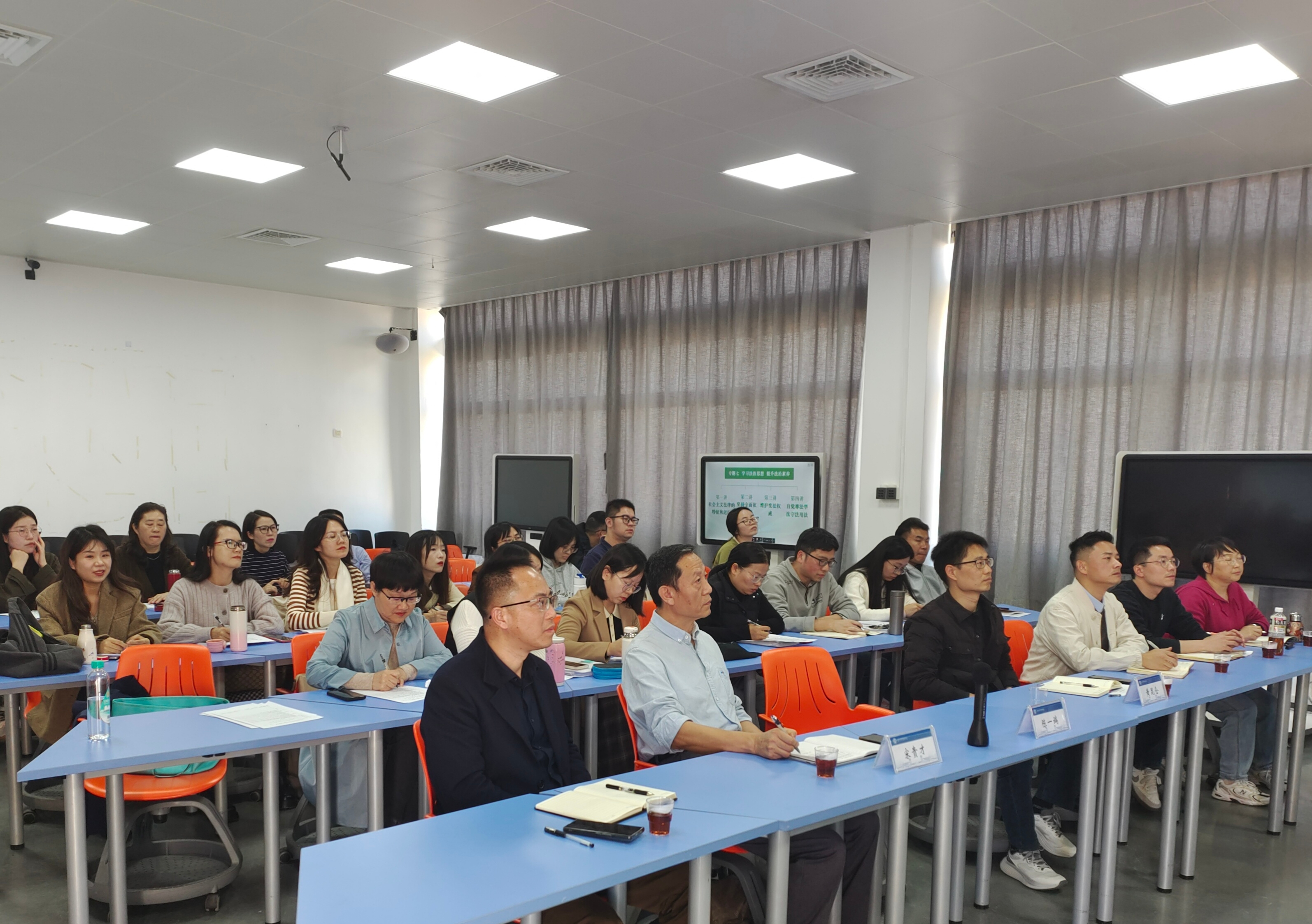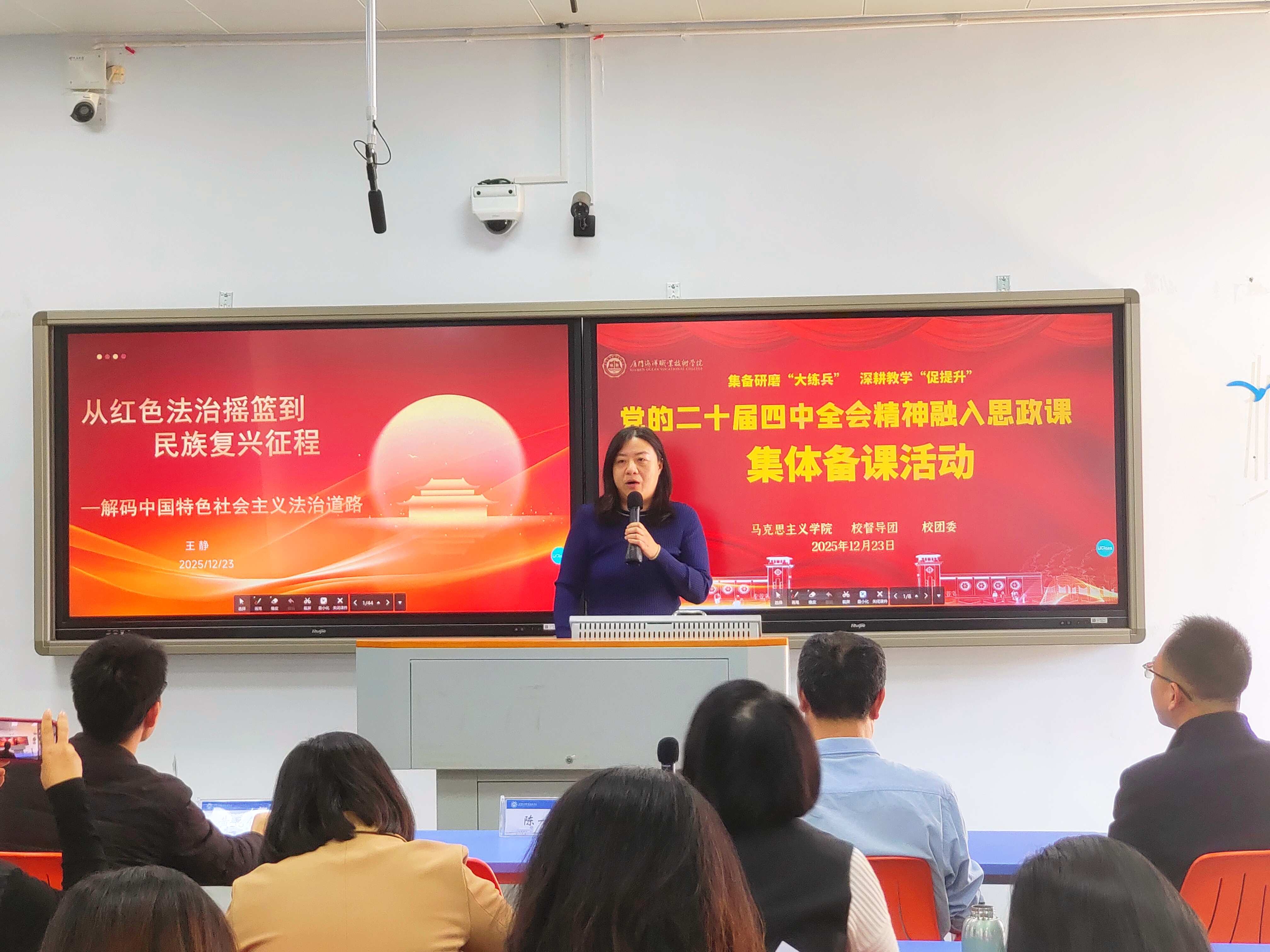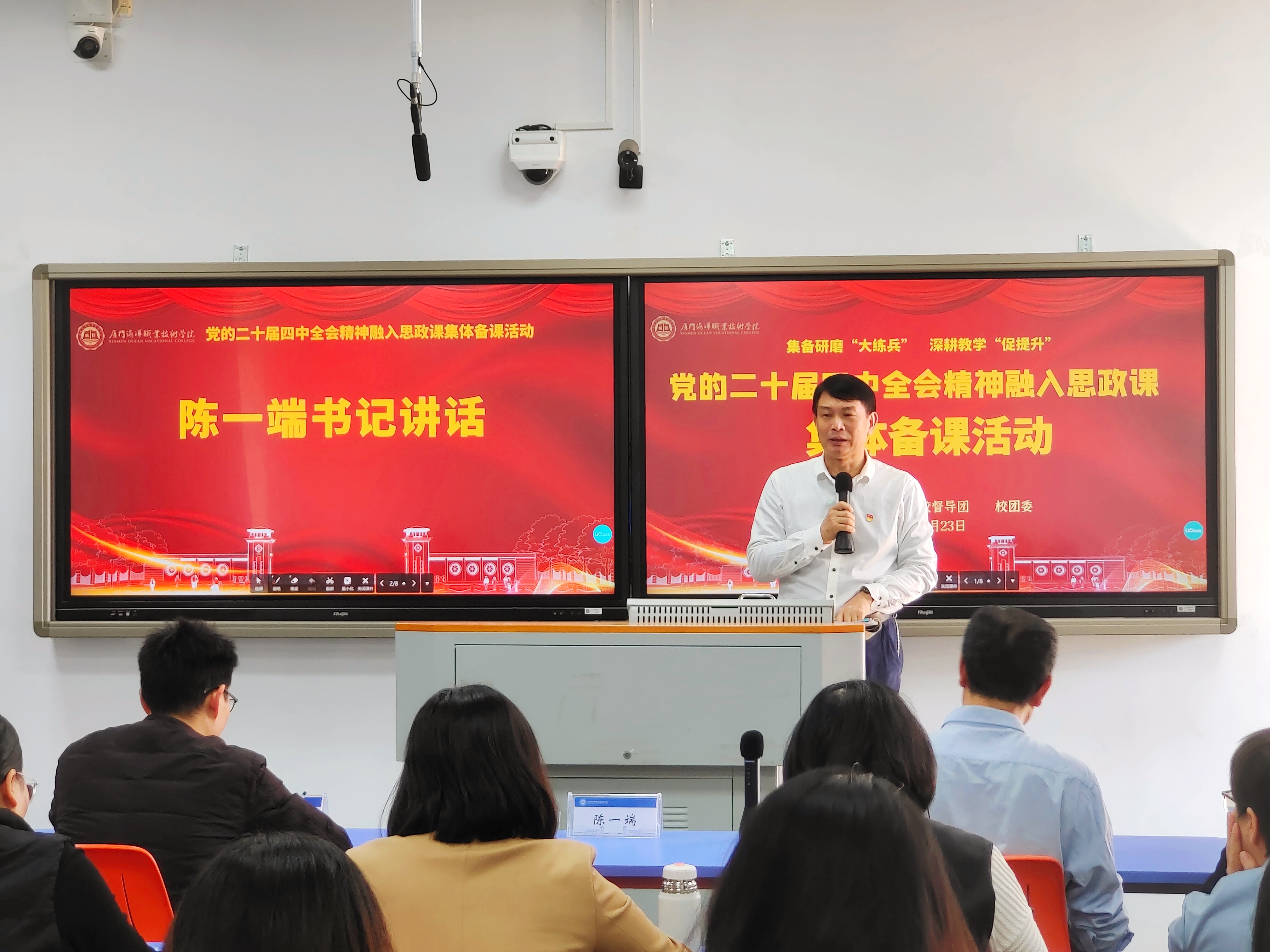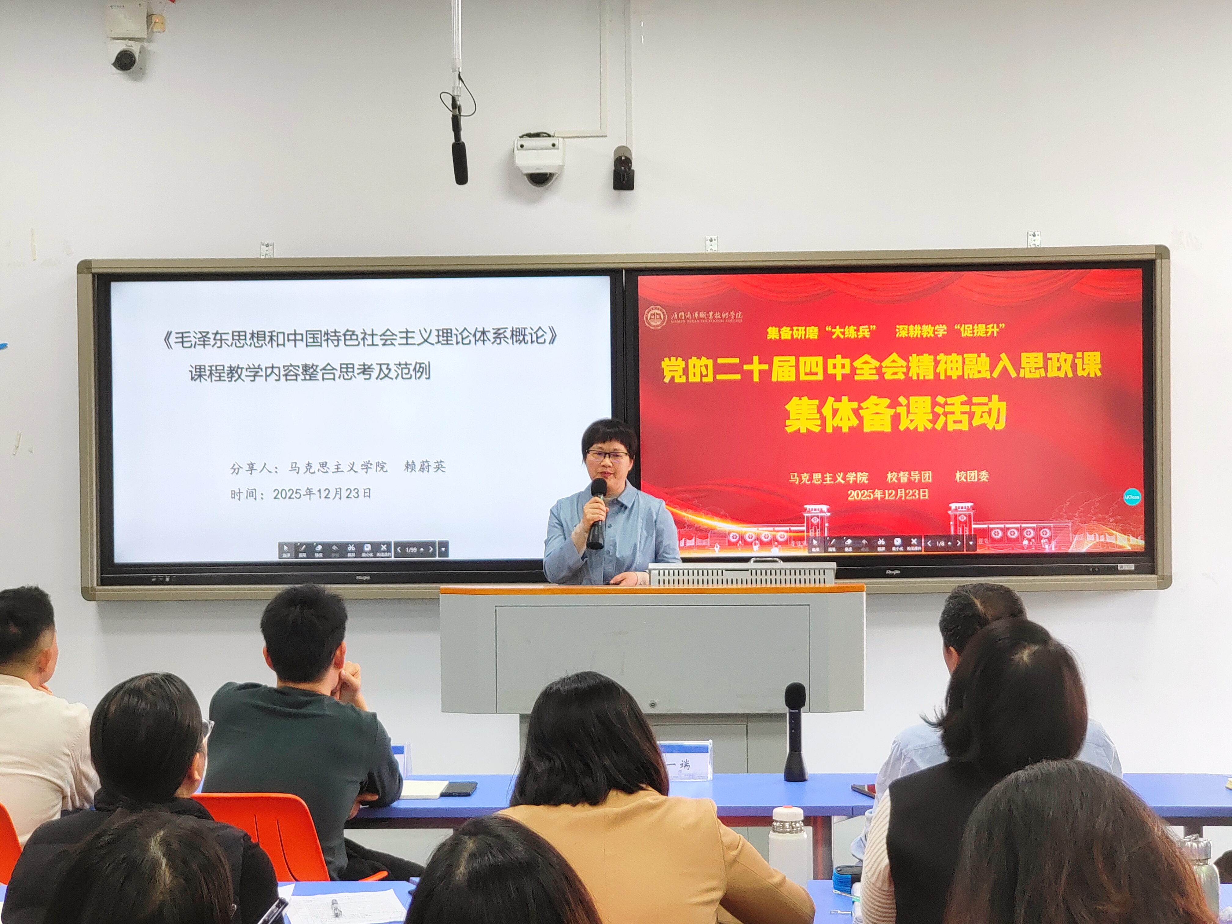 为深入学习贯彻党的二十届四中全会精神,推动全会精神融入思政教育教学实践,12月23日,我院在翔安校区1503智慧教室举行“党的二十届四中全会精神”融入思政课集体备课会。校党委书记陈一端到会指导,校督导团团长宋贵才教授、校团委副书记黄昆仑以及马克思主义学院全体教师参会。