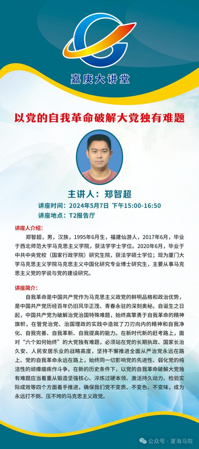 郑智超,男,汉族,1995年6月生,福建仙游人,2017年6月,毕业于西北师范大学马克思主义学院,获法学学士学位。2020年6月,毕业于中共中央党校(国家行政学院)研究生院,获法学硕士学位;现为厦门大学马克思主义学院马克思主义中国化研究专业博士研究生,主要从事马克思主义党的学说与党的建设研究。