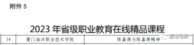 12月1日,福建省教育厅下发《福建省教育厅关于公布2023年省级职业教育信息化和产教融合重点项目的通知》文件,马克思主义学院申报的《陈嘉庚与陈嘉庚精神》课程荣获省级职业教育在线精品课程。