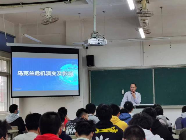 授课过程中,马国玄通过真实丰富的图片和相关视频引入主题,带领师生深入分析俄乌关系,层层递进地讲解了俄乌冲突背后的大国博弈是如何形成的,分析了乌克兰局势对国际间关系的影响,引导师生正确理解俄乌冲突影响下的百年未有之大变局以及对中国产生的影响。他结合党的二十大精神启发同学们得出结论:无论国际风云如何变幻,我们都要坚持做好自己的事,保持战略定力,坚持以中国式现代化推进中华民族的伟大复兴,他希望同学们要学会在复杂的世界发展变局中保持正确立场,树立远大理想,努力学好专业知识,在实现中华民族伟大复兴中国梦的进程中贡献一份力量。