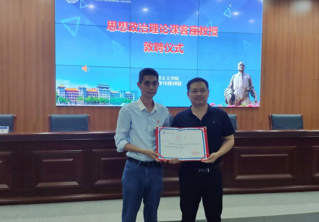 ​本次讲座还举行了厦门海洋职业技术学院思想政治理论课客座教授敦聘仪式,马克思主义学院院长林杰钦代表学校为王刚教授颁发聘书。